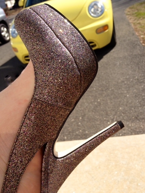 Oh, and I kind of adore the shoe shot. I love that you took a picture of them while ON your feet! =) Even better, when I took my first look at the pic I saw the yellow and thought it was a cab. So then I’m imagining you downtown somewhere, standing on the sidewalk, trying to take pictures of your fancy, sparkly shoes! Hahaha! Awesomeness.