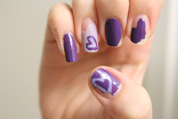Hello to my Berry Patch and hello to the readers of Love for Lacquer!  I am very excited to be writing my very first guest post π  I want to share a little trick I sometimes use when I have a chipped manicure and I am either feeling too lazy to break out the nail polish remover and start over, or when I am going out and don’t have time to do a new manicure.  My secret quick fix is to apply a layer of shatter nail polish right over the old, chipped manicure!
