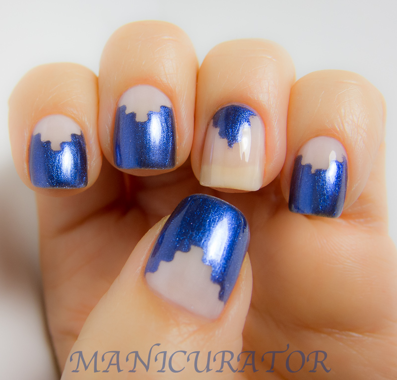 I used Gelous base coat and 2 coats of OPI Care to Danse from the New York City Ballet 2012 collection, which is a dreamy jelly/sheer lilac. Gah. I.am.in.love!!! After this was COMPLETELY dry, I used my zigzag edging scissors to cut tape for chevrons. OPI Into the Night from the 2012 Spider-Man Collection as my contrasting color, is an amazing slightly frosted/metallic deep blue. Like, a night blue, yeah!! π I used 2 coats of this as well.