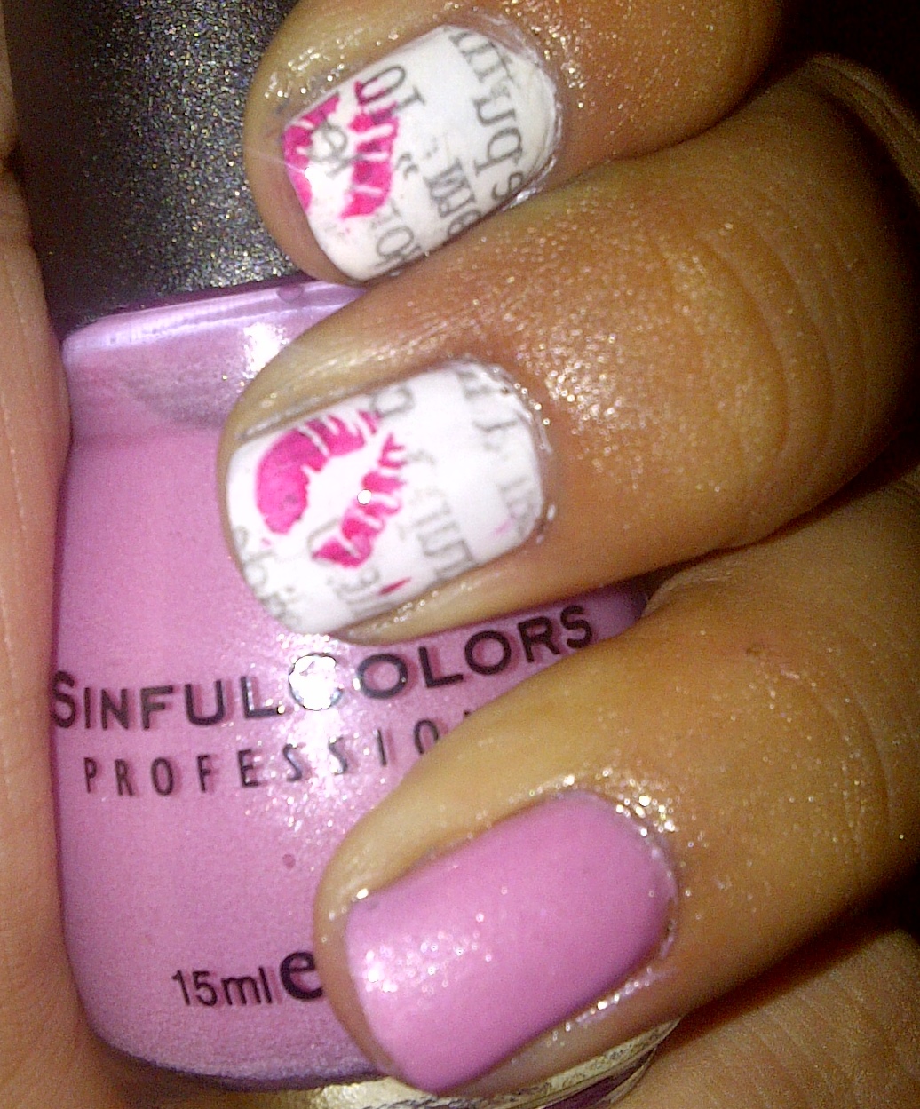To start off, I’ve been dying to do newsprint nails for a long time. I just haven’t had the time or was too lazy to sit down and actually do them. I saw this mani posted by Julep on Pinterest and was dying to try it. Instead of just newsprint nails, they called them “Love Letter Nails”. Too cute. These would be perfect for Valentine’s Day or even your honey’s birthday! For this manicure, I used newspaper, Wet n Wild French White Crème as the base, Sinful Colors Flutter for the accent & Revlon Mon Cherry for the lips (Bundle Monster plate BM02). I’ve read a few different ways that you can apply the newspaper to your nail so I decided to try it out. On my pointer finger, I dipped my finger in plain vodka, and the middle finger in rubbing alcohol. The vodka definitely produced a darker, clearer print but I like the rubbing alcohol version better because it’s lighter.