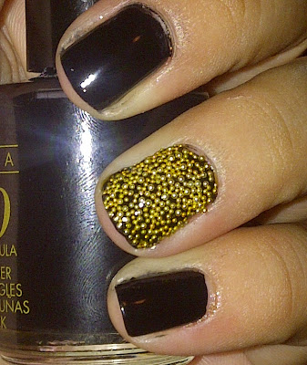 Another Pinterest idea that I’m sure many of you have seen on blogs as well is the microbead/Kaviar nail. I found my Pinspiration from Emily from Lacquerologist (lacquerologist.blogspot.com). I’m going to stick with calling it the microbead mani for this post because of recent drama with a certain company but that’s another story for another day! You can find microbeads at any craft store and I know a few girls who have found packs of 6 at their local Dollar Tree or Dollar Store for only a few bucks. I themed mine around an event I was going to for my college & our colors are, you guessed it, black & gold.