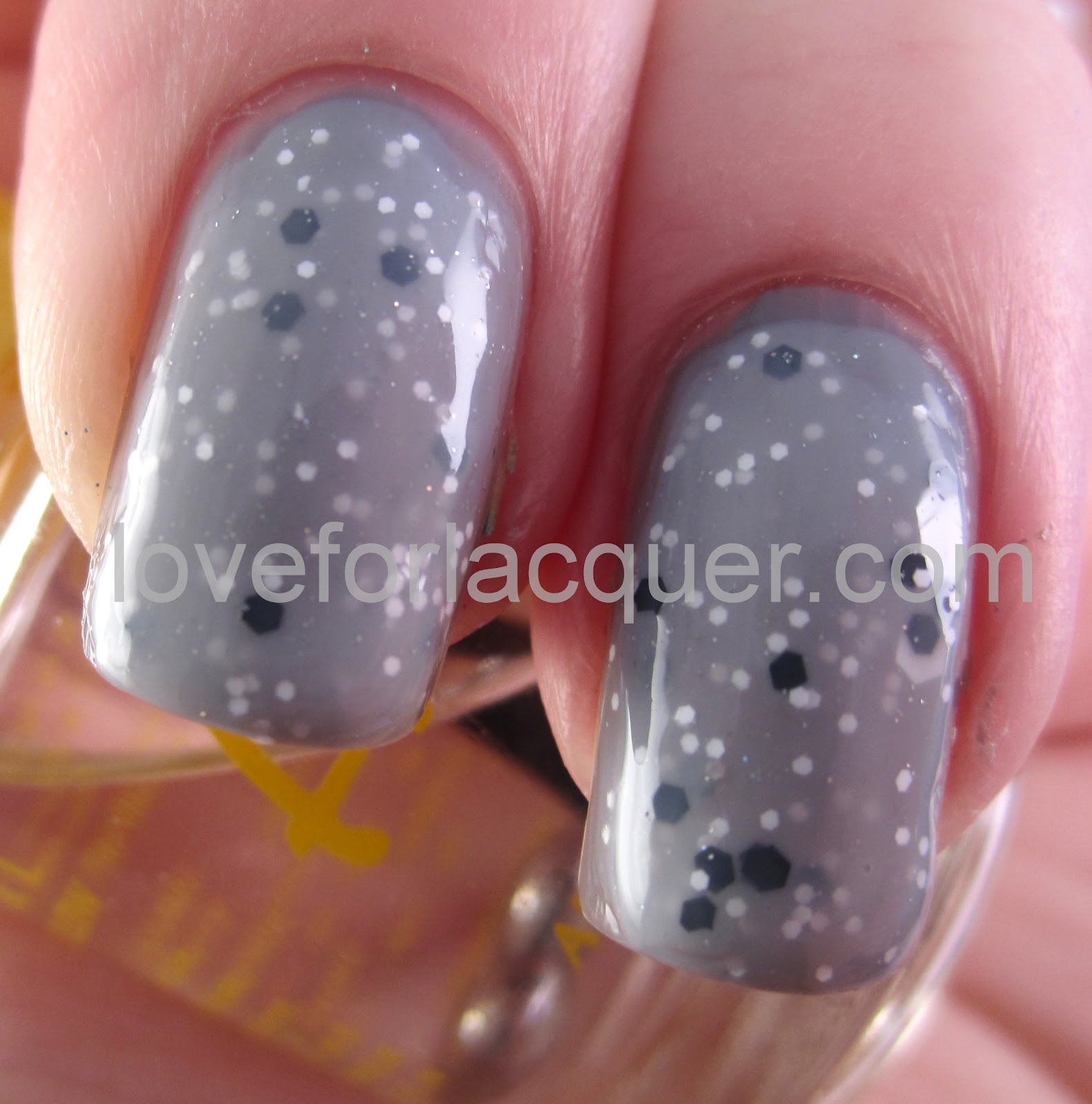 Now onto the polish! I layered this over Milani Just Grayt and the combo was PERFECT! I ended up using one coat of the Milani and two and a half coats of Scuttle. Half? Yes. I wanted more black dots and had difficulty getting them out of the bottle the first time. But all in all, it worked out!