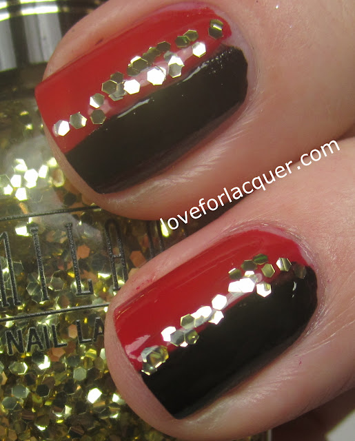 Haute Rod – This was one I ended up doing over. The first design came out SO crappy and I wasn’t pleased with it.. but this one I love! Using scotch tape I sectioned off the nail and painted one half black swift & the other rapid cherry. To give it a little bling, I sponged on some gold glitz.