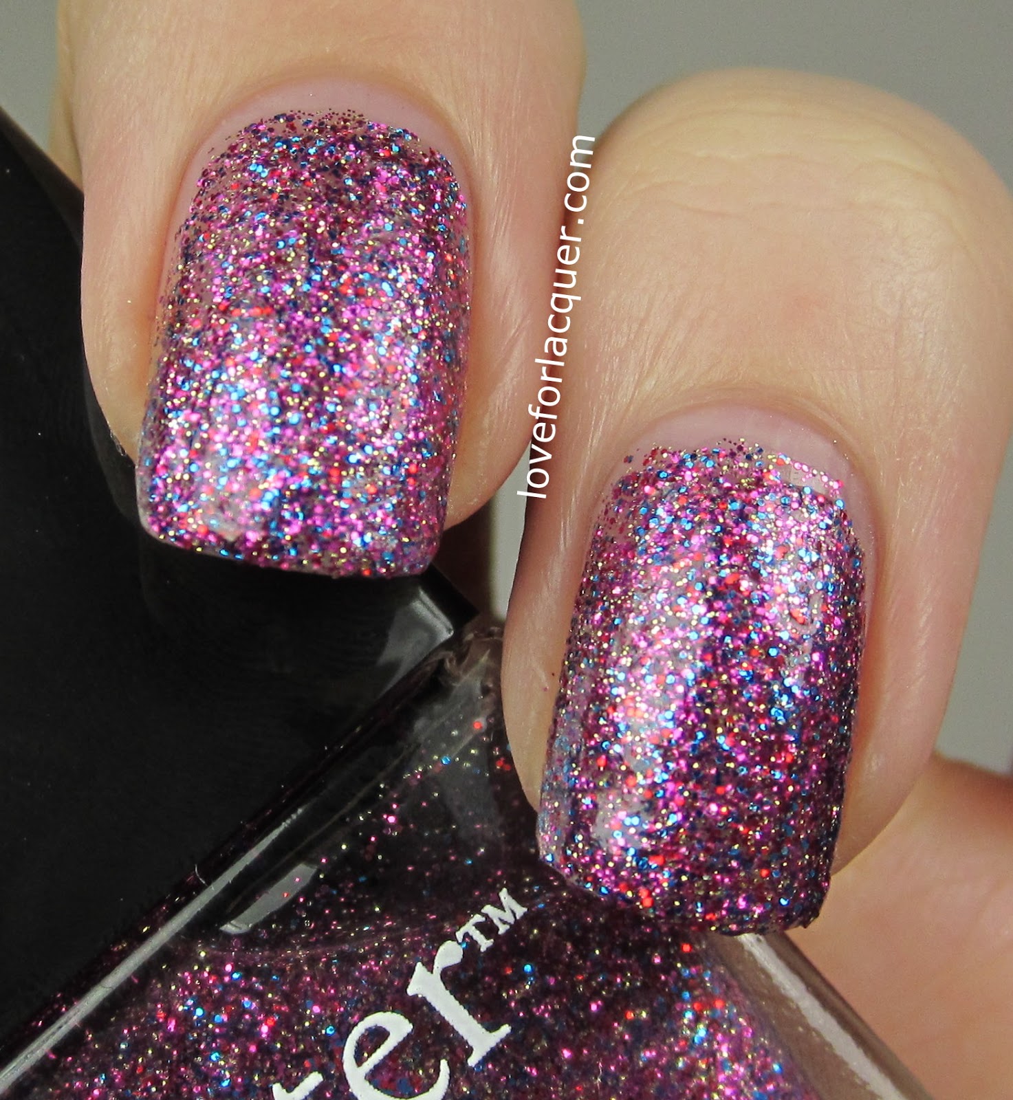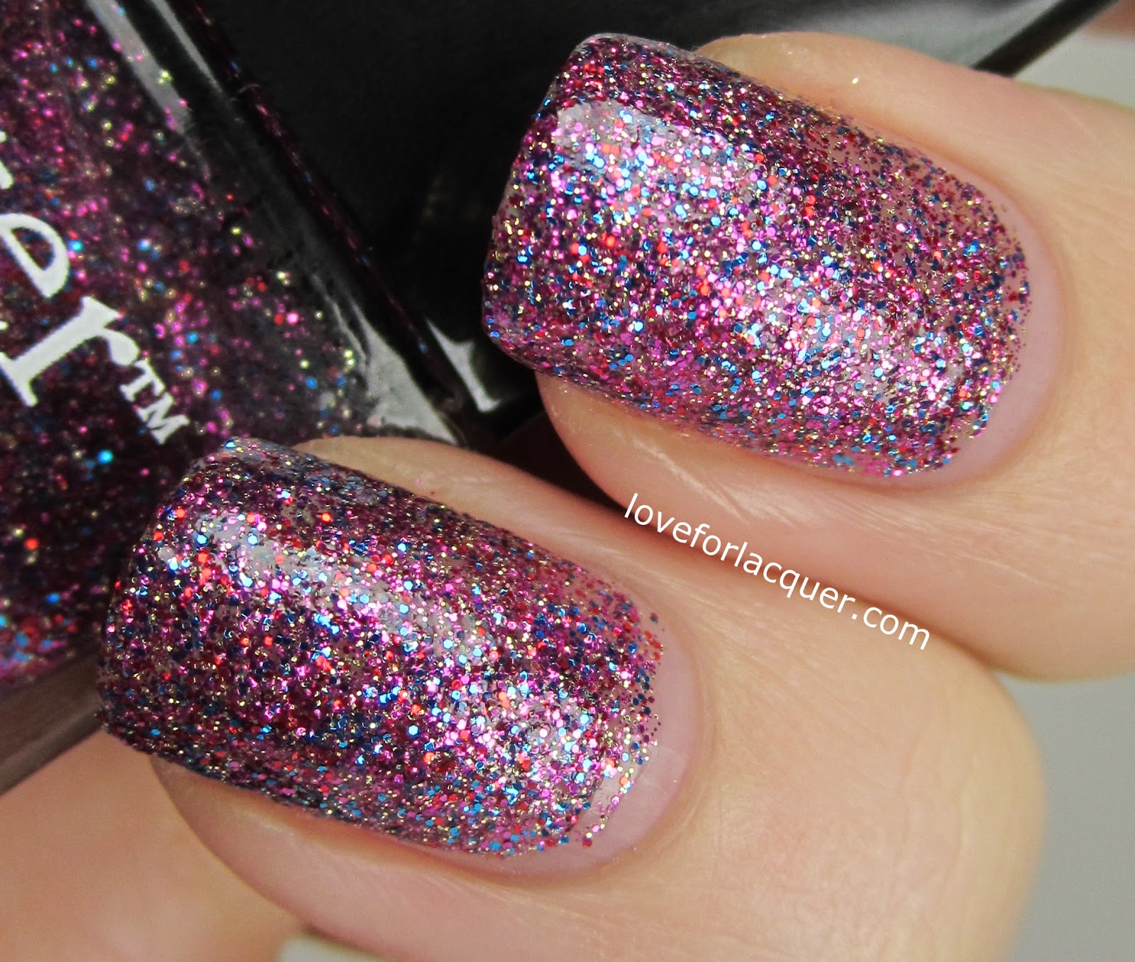 Lovely Jubbly – Holy glitter Batman! Purple & teal & red & gold.. OH MY! This one is so stinkin beautiful I can’t even stand it! The coverage is great – I used three coats for the photos below.