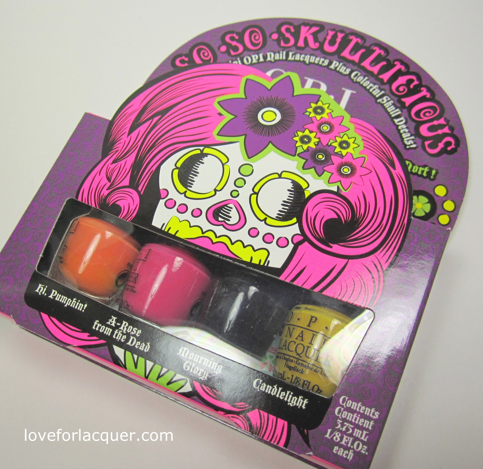 Happy Monday! I hope all of my East Coast lacquer lovers are staying safe with this crazy hurricane we’re having! I am keeping my fingers crossed that we don’t lose power for a number of days. Last year around this time, we had a freak snowstorm and Halloween got cancelled.. If the weather keeps up, it looks like it will happen again! Poor Rylan! But you can still get festive.. Check out this adorable Halloween set that OPI released called So So Skullicious. It contains 4 mini polishes and a pack of Sugar Skull nail decals!