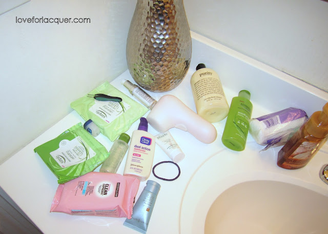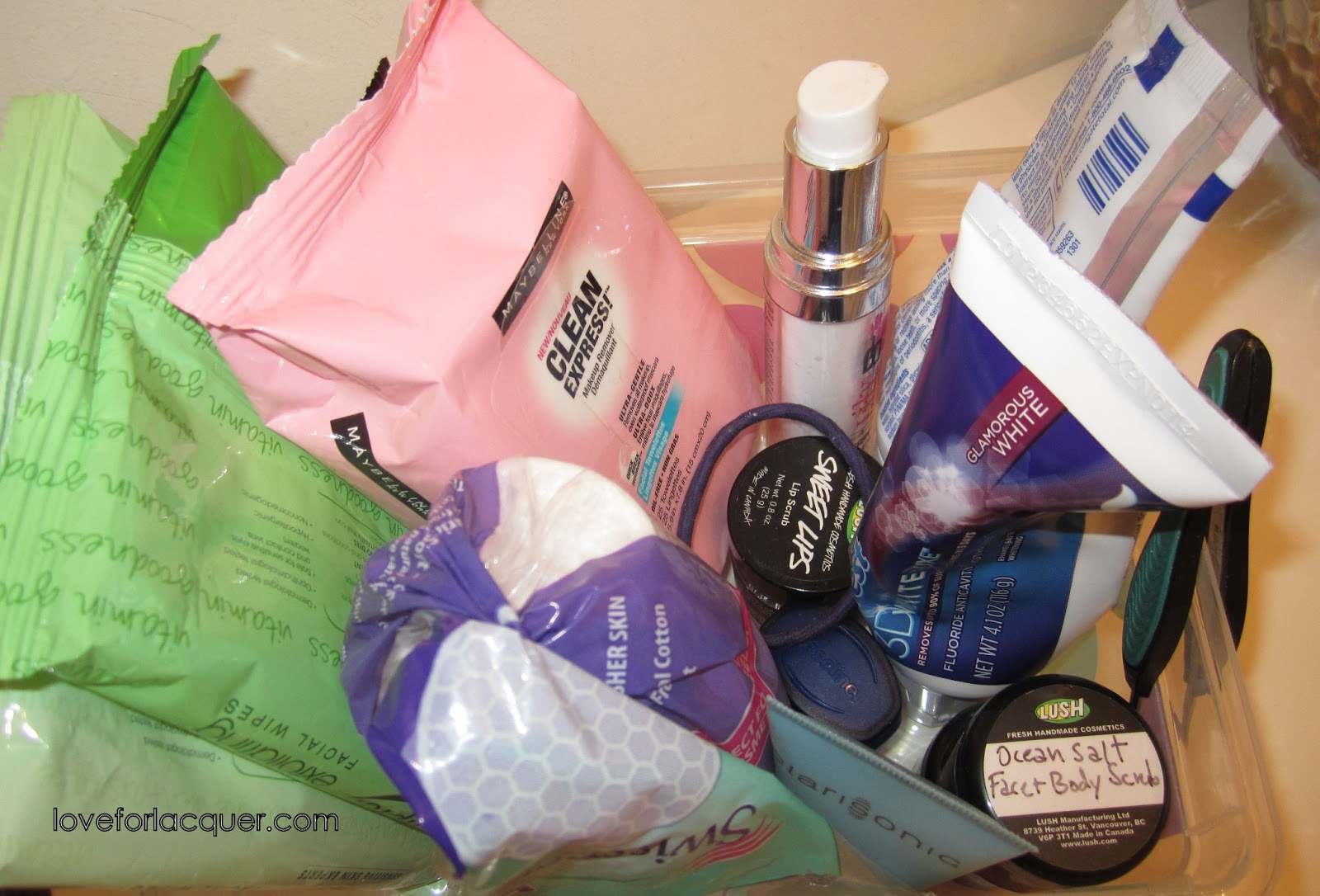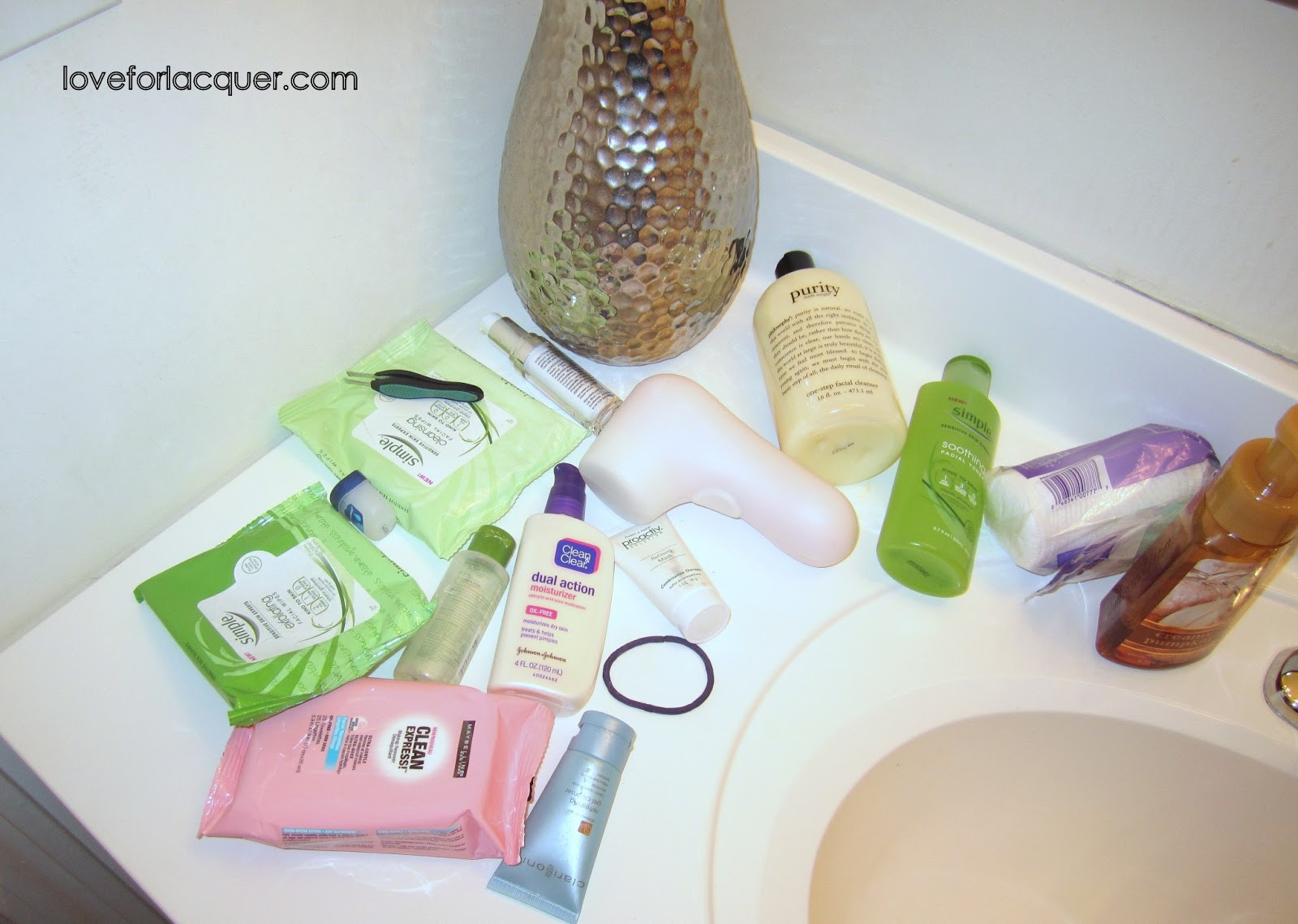 I have a 16oz Purity Facial Cleanser, Clarisonic Mia2 IN it’s bulky case, Proactiv Refining Mask, Simple Toner, Simple Eye Makeup Remover & my Clean & Clear Dual Action Moisturizer.