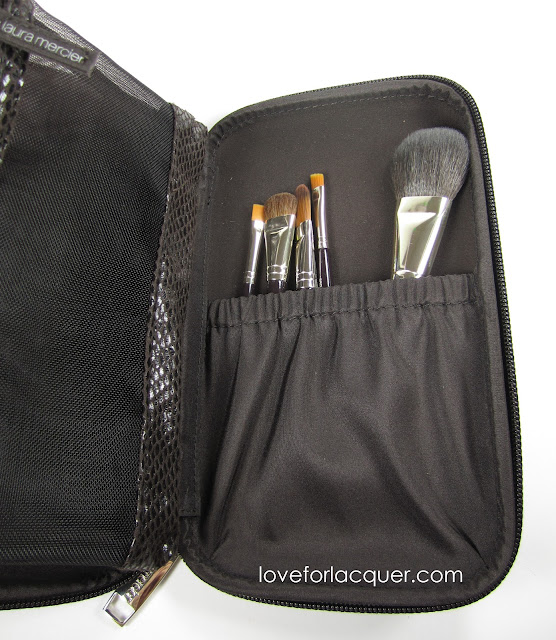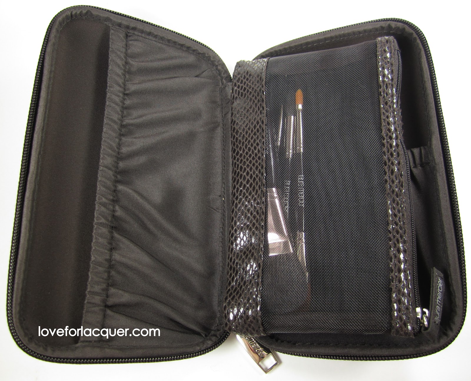 The Laura Mercier Deluxe Travel Collection comes with a sturdy hard shell chocolate brown snakeskin design case that zips all the way around and has 3 compartments inside.