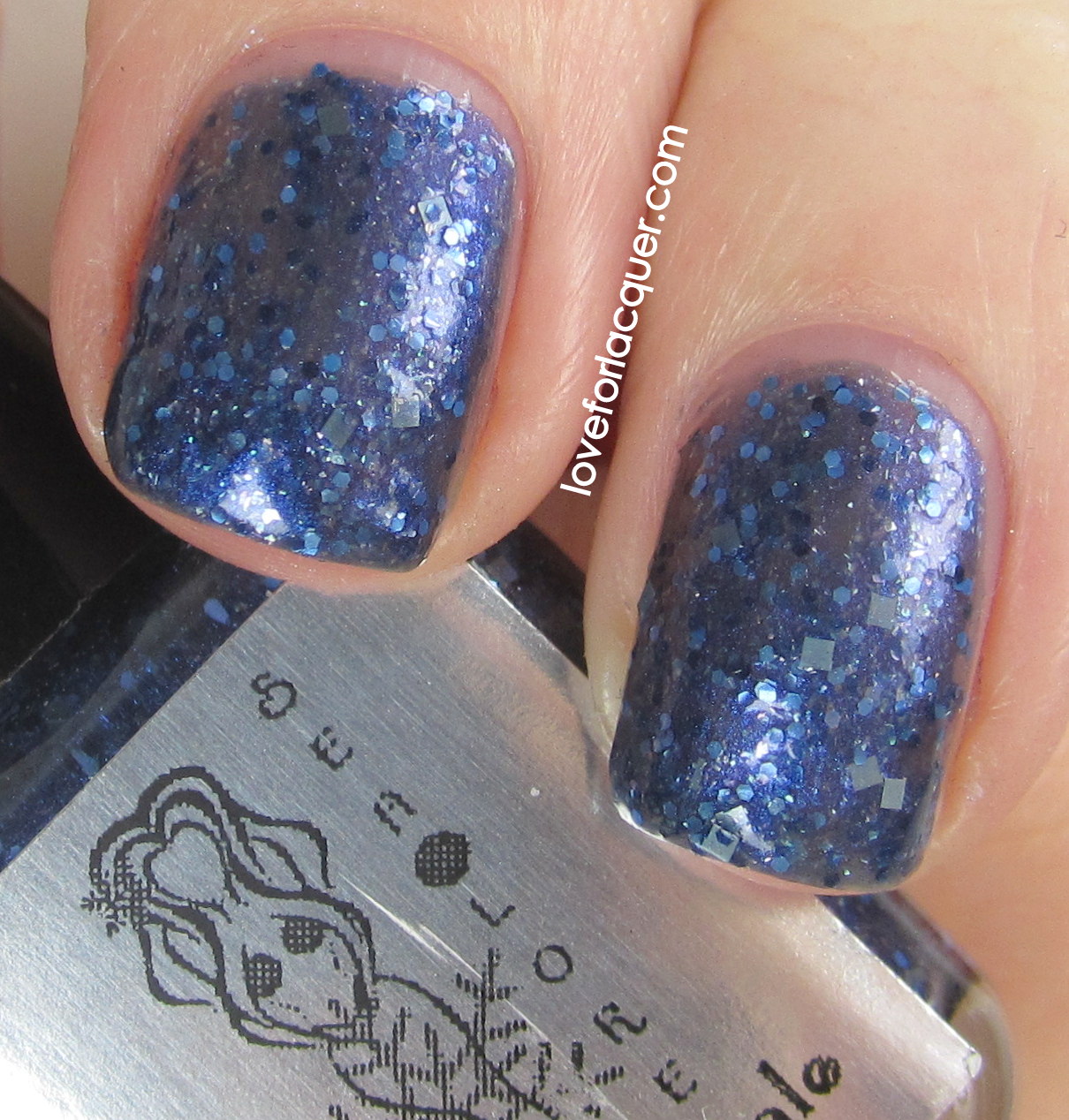 Wintry Whale – Dark blue base with different shades of blue glitter & baby blue squares. This is probably my favorite of the bunch! Photo below shows three thin coats.