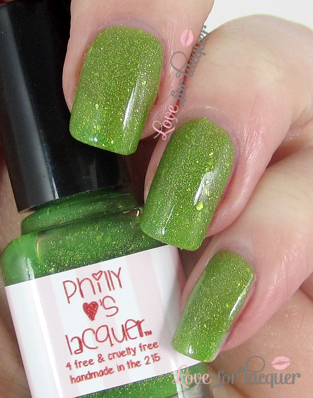 Froggy Car – Inspired by the Wench Brigades of the Philly Mummers. Grass green holo with gold micro glitters & flakies. How freaking cool is this shade!? I absolutely love the color and love the scattered flakies within. Photo below shows two coats.