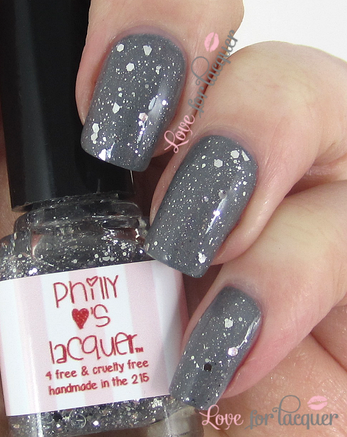 Avenuers – Inspired by the Fancy Brigades of the Philly Mummers. Grey scattered holo with rainbow micro glitter. I am always a sucker for a good grey polish and this one is amazing! Formula was spot on. Photo below shows two coats.