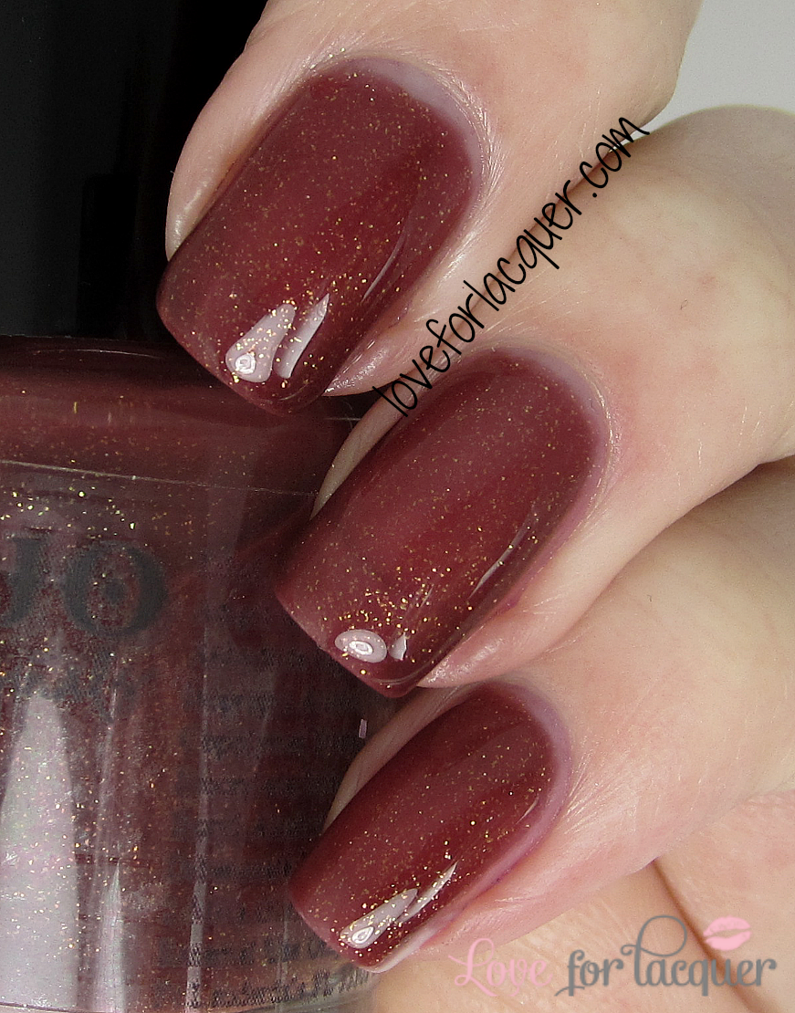 Goldstone – Mahogany brown with gold sparkle. I am so drawn to this shade! I tried to get it as color accurate as possible, but it is definitely on the brown side. I love it! This is an extremely limited edition shade with only about 25 bottles made, so snatch it up while you can! Photo below shows two coats plus HKGirl top coat.