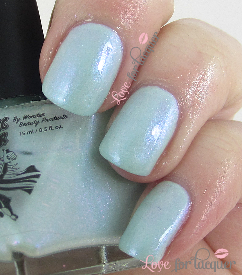 Shrinking Violet – Pastel violet shade with aqua & pink shimmer. This shade is SO SO pretty in person! Photo below shows three thin coats plus top coat.