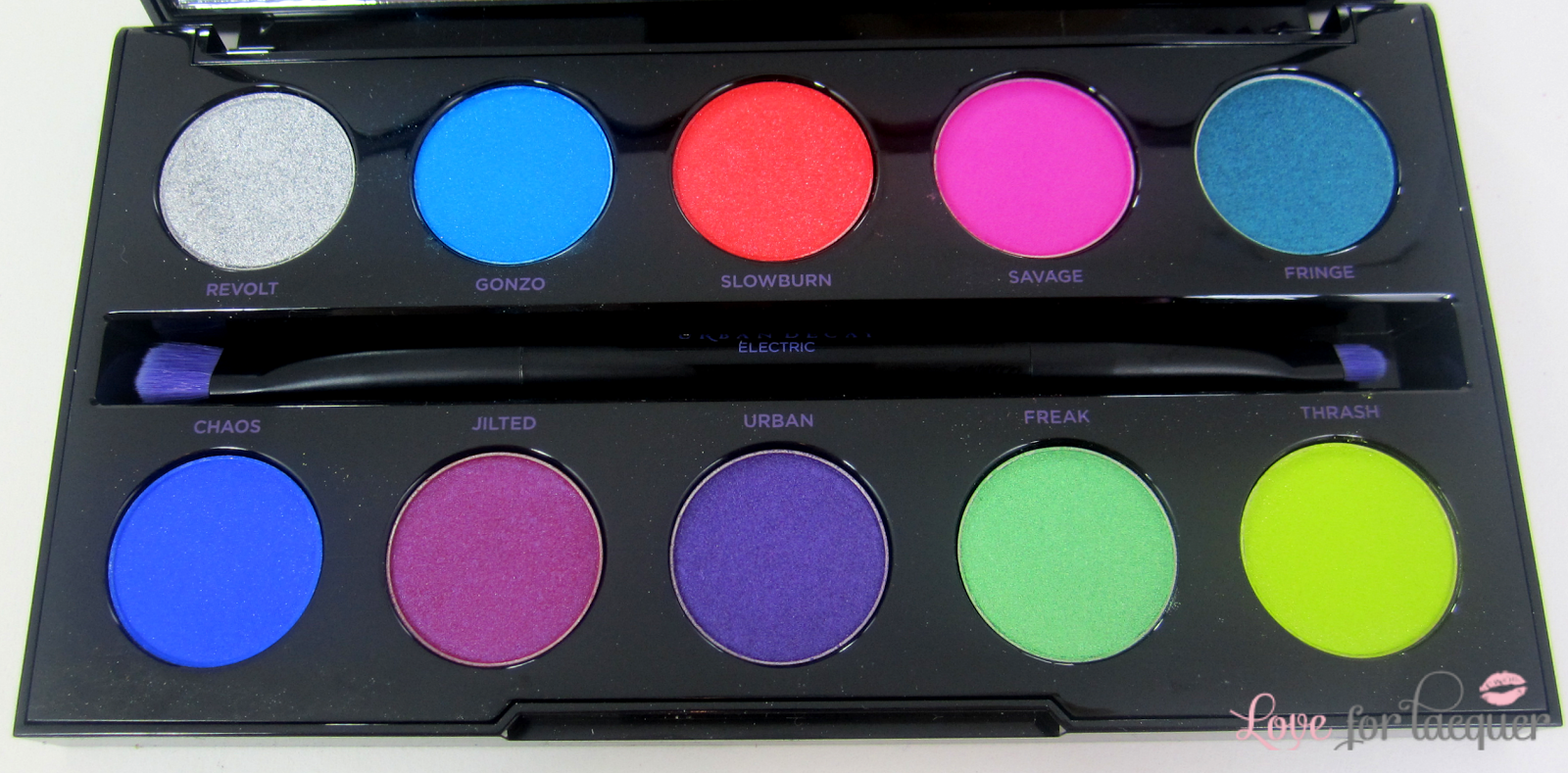 The Electric palette contains a nice mix of matte & shimmer shades. Eight of these shades are brand spankin’ new & 2 of the shades, Chaos & Revolt are re-promotes.
