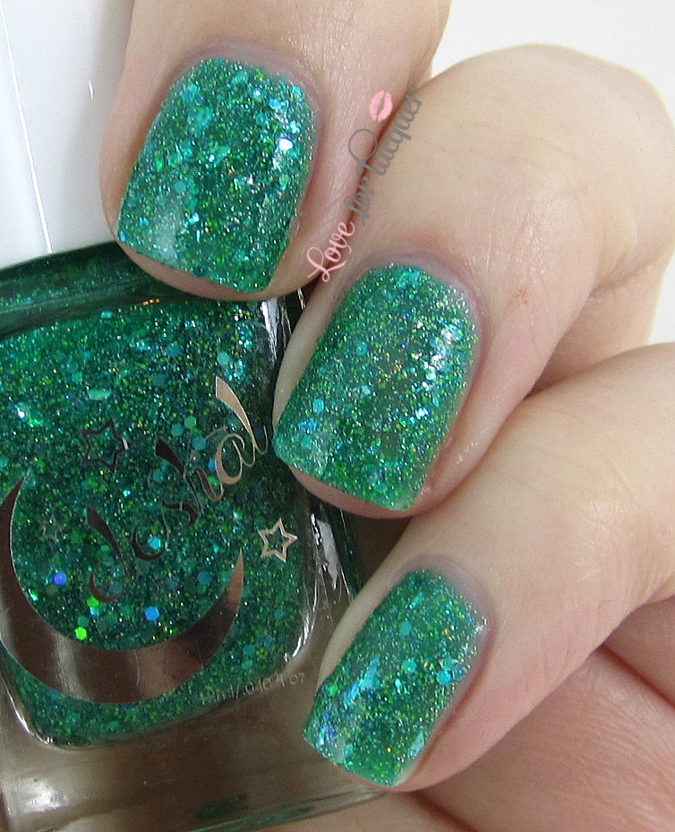 Celestial May LE – Dusty green scattered holo. LOVING this shade of green for Summer! Photo below shows two coats.